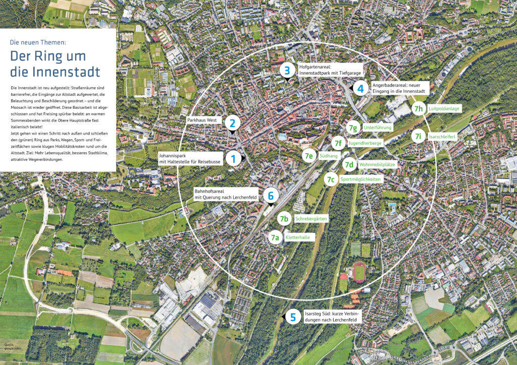 Wir verbinden konsequent: Grün (Parks, Hänge, Auen) + Wege (Fuß/Rad) + Mobilität (Bus, Bahn, Sharing) + Kultur/Handel (lebendige Erdgeschosse, Orte zum Verweilen). Mit dem grünen Ring um die Innenstadt wird Freising noch lebenswerter – für alle Bürgerinnen und Bürger und für unsere Gäste.